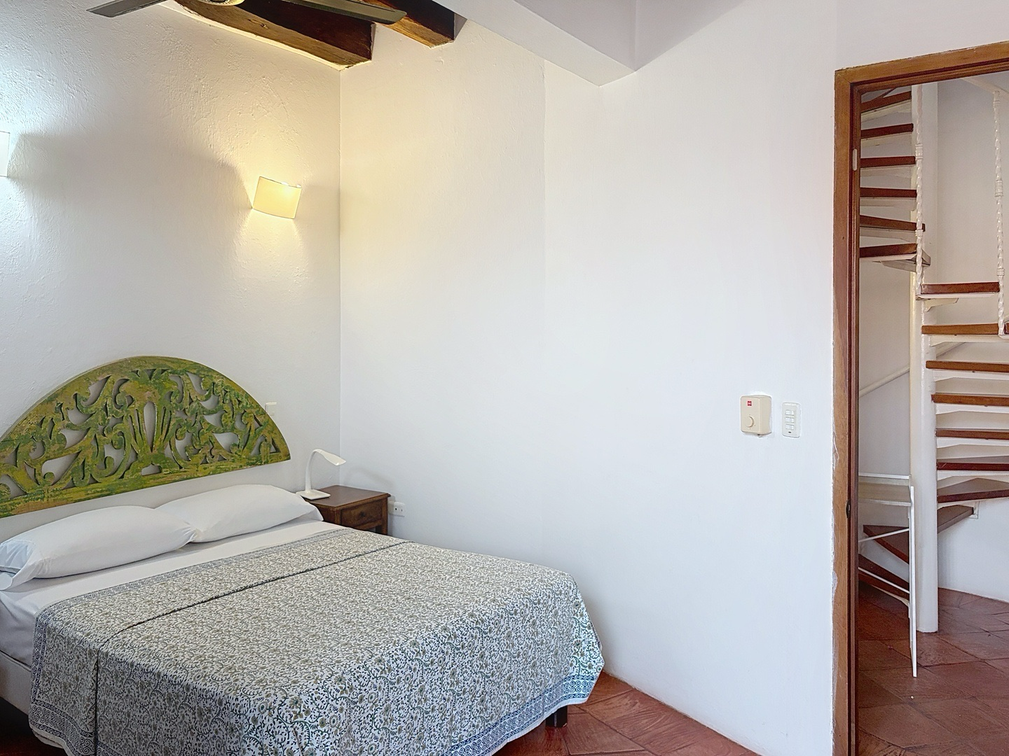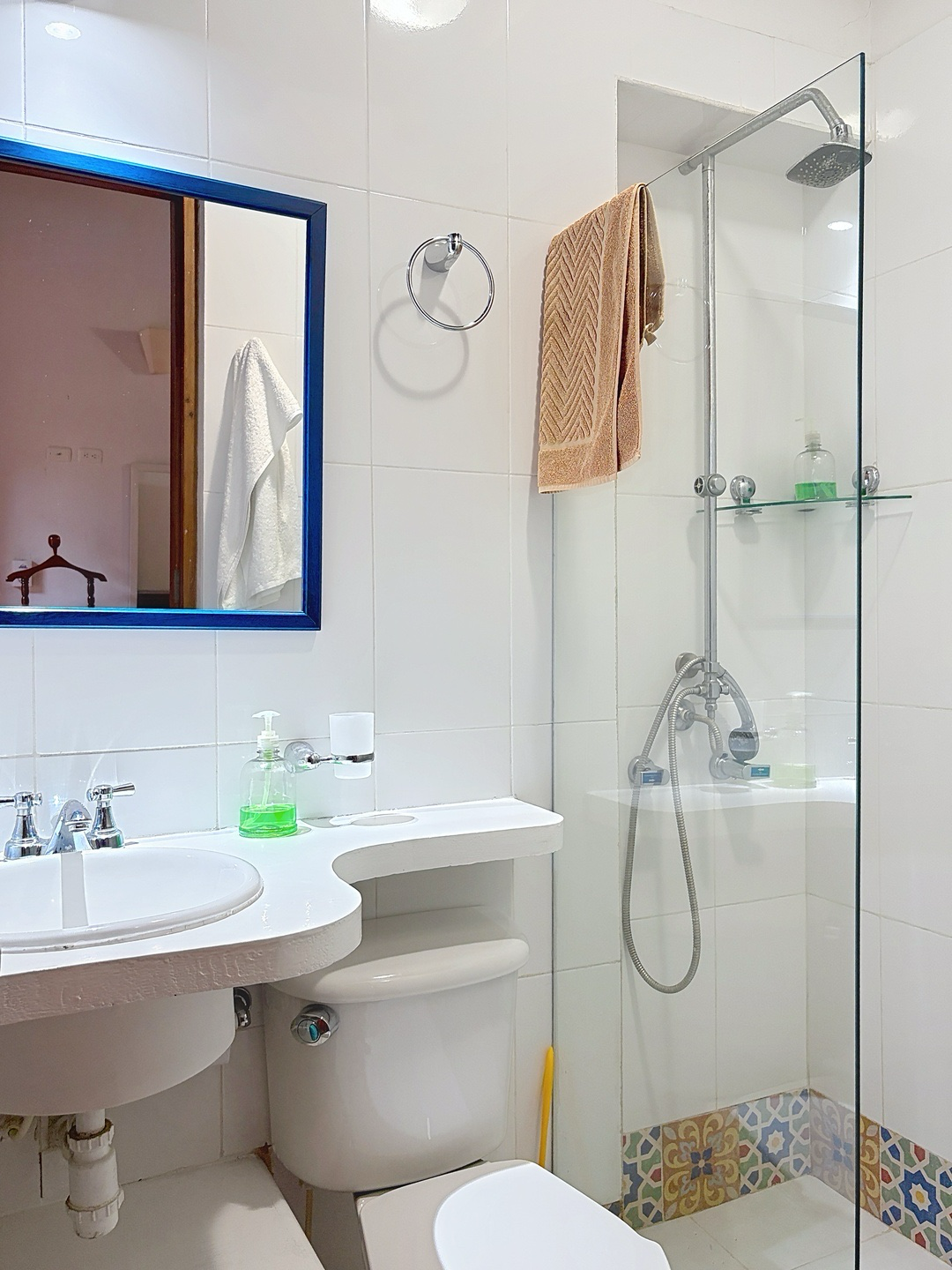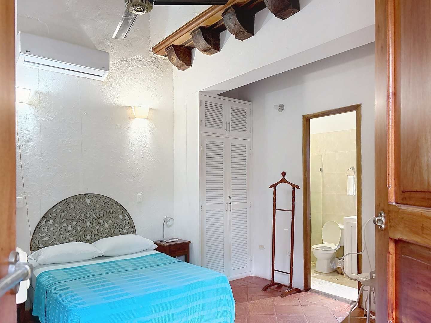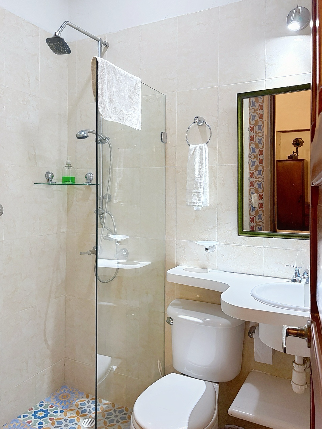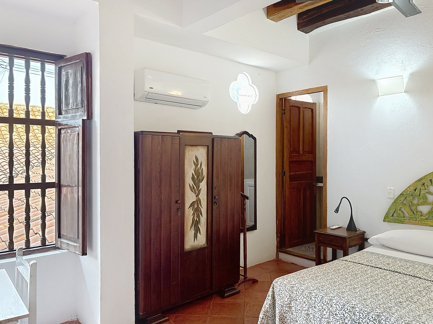 Ubicada en el segundo piso, esa habitación de unos 15m2 con vista al patio y cama doble tiene una sala de ducha completa, aire acondicionado y ventilador de techo.