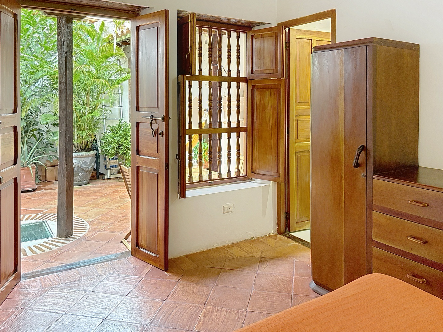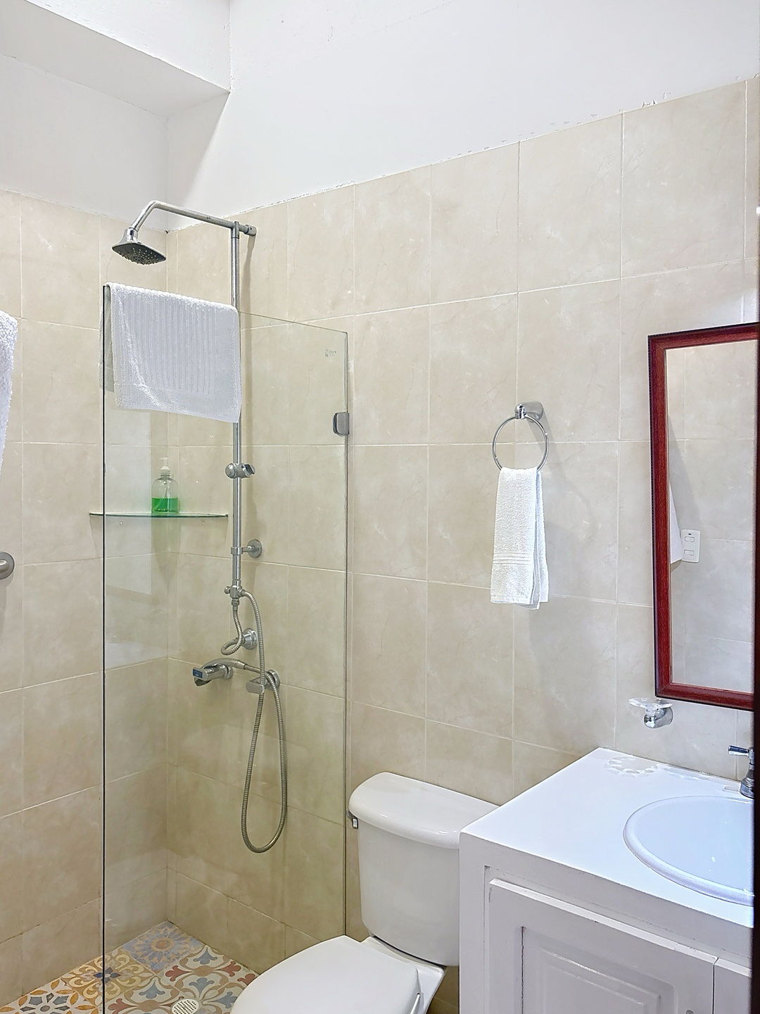 Ubicada en el patio, esa habitación de unos 15m2 con techo alto cuenta con una cama doble y tiene una sala de ducha completa, aire acondicionado y ventilador de techo.