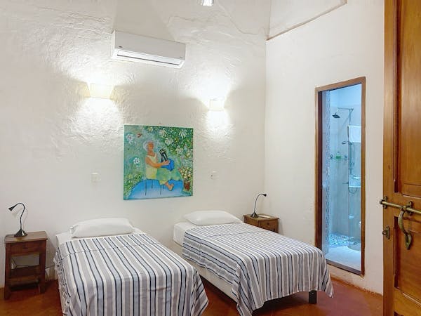Located in the ground floor, this approximately 160 sq.ft room with high ceiling and two single beds is equipped with complete private shower-room, air conditioning and ceiling fan.