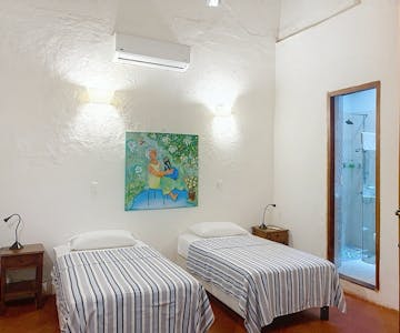 Located in the ground floor, this approximately 160 sq.ft room with high ceiling and two single beds is equipped with complete private shower-room, air conditioning and ceiling fan.